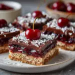 A delicious no-bake dessert featuring a chocolate and coconut base, layered with a cherry filling and topped with chocolate.
