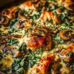A comforting and creamy chicken bake featuring fresh spinach, earthy mushrooms, and gooey cheese, perfect for weeknight dinners or special gatherings.