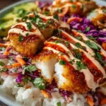 - Assemble the Bowls: Start with a base of rice or quinoa in each bowl. Top with crispy fish strips, shredded cabbage, grated carrots, and a sprinkle of cilantro. Drizzle generously with the chipotle sauce.