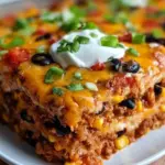 A warm, comforting burrito casserole filled with layers of seasoned meat, beans, and creamy cheese, perfect for any occasion.
