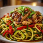 A delightful stir fry featuring tender chicken and zucchini noodles in a savory garlic sauce, perfect for busy weeknights.