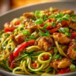 Final Assembly: Combine the sautéed zucchini noodles with the chicken and vegetable stir-fry, tossing everything to mix. Ensure the noodles are evenly coated with the flavorful sauce.