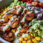 Grilled Shrimp Bowl with Avocado, Corn Salsa & Creamy Garlic Sauce invites you to embark on a vibrant culinary journey, one bite at a time. Imagine the sizzling sound of succulent shrimp hitting a hot grill, releasing an intoxicating aroma that wafts through the air, beckoning you closer. The shrimp takes on a beautiful char, crisping slightly on the outside while remaining juicy and tender inside, their flavor intensified by a zesty marinade. Picture the creamy richness of diced avocado mingling with the crunch of fresh corn kernels, creating an enticing contrast. A sprinkle of bright red onion and juicy tomatoes adds bursts of color and freshness that make the dish a feast for the eyes as well.