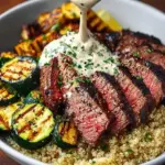 Assemble Your Bowl: Layer the bottom of your serving bowls with the fluffy quinoa. Slice the rested steak into strips and arrange them atop the quinoa. Add the grilled zucchini, and finish it all off with a lavish drizzle of the creamy garlic sauce.