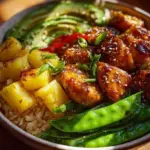 A delightful Hawaiian Chicken Bowl that combines marinated chicken, vibrant vegetables, and fluffy rice, offering a taste of tropical flavors right in your kitchen.