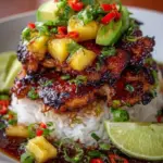 To assemble your stack, take a generous scoop of jasmine rice as the base on a serving dish. Layer the grilled chicken strips on top, followed by fresh pineapple, red bell pepper, and avocado slices.