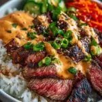 Slice and Serve: Once the steak rests for a few minutes, slice it thinly against the grain. Assemble your rice bowls by layering the jasmine rice, top with steak slices, and shower with crunchy vegetables and green onions. Drizzle generously with the spicy cream sauce.