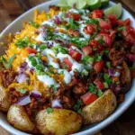 As the bowl beckons, aromas waft through the air, a harmonious blend of seasoned potatoes grilled to perfection, spicy taco meat, and a bright sprinkle of fresh cilantro. The textures dance in delightful contrast—from the fluffy, rich potatoes to the crispiness of the tortillas, woven like a beautiful tapestry. The first bite brings a rush of creamy potato goodness, followed by the savory notes of seasoned beef, the freshness of vegetables, and the decadent drizzle of sour cream. It’s an unforgettable flavor journey that resonates with nostalgia and excitement, leaving you craving more.