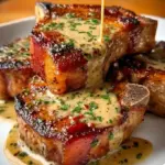 - Serve: Plate the pork chops, drizzle with the sauce, and top with crumbled bacon.