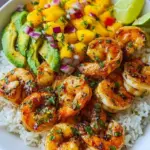 A vibrant Shrimp and Avocado Bowl featuring grilled shrimp, creamy avocado, and fresh mango salsa, all layered over a bed of rice for a delicious tropical feast.