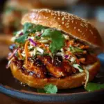 As you take in the enticing aroma of garlic and ginger mingling as the chicken cooks, your mouth waters in anticipation. The crunchy slaw adds a refreshing contrast, with its vibrant green cabbage and bright orange carrots harmonizing beautifully, while a creamy dressing ties it all together. Topped off with crunchy sesame seeds and fresh cilantro, this sandwich isn’t just a meal—it’s a celebration of flavor, perfect for any occasion, from family dinners to weekend get-togethers.