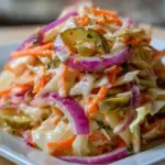 A vibrant slaw featuring shredded cabbage, carrots, pickles, and red onions cloaked in a creamy, tangy dressing, delivering a delightful crunch and a sweet heat.