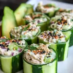 Crunchy cucumbers filled with a creamy chicken salad, fresh vegetables, and herbs, perfect for appetizers or lunch.