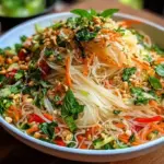 Picture the first bite—smooth glass noodles playfully intertwining with a symphony of crunch from shredded carrots, fresh lettuce, and cool cucumber. The refreshing mint and cilantro burst forth, offering a fragrant lift with every forkful. Each ingredient feels like a celebration, a festival of textures and flavors in your mouth. You don’t just eat this salad; you indulge in it, savoring the burst of freshness that transforms any ordinary day into a vibrant feast of happiness.